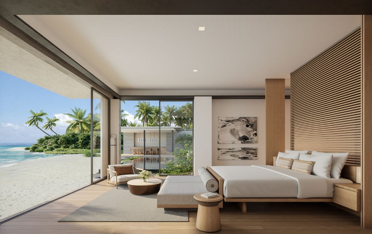 Set along the island’s powder-soft beachfront, the Two-Bedroom Beach Pool Villas offer 265 square metres of indoor-outdoor living that feels both expansive and deeply calm. Interiors are deliberately restrained: warm timber finishes, textured stone, and sliding glass doors that dissolve the boundary between inside and out.