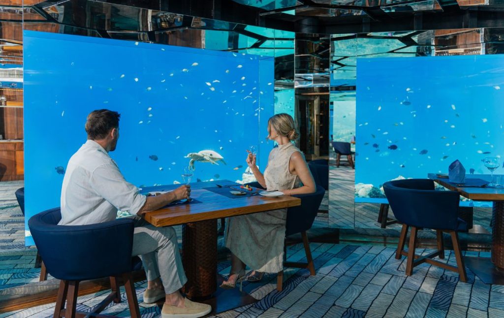 The journey begins underwater. SEA, the resort’s award-winning fine-dining restaurant and wine cellar, sits several metres below the ocean’s surface, its curved glass walls framing a constantly shifting marine tableau. Sharks, turtles, and tropical fish glide past as dinner unfolds, creating a setting that is quietly surreal rather than overtly dramatic.