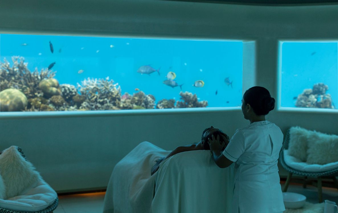 Above the waves, wooden walkways lead to overwater pavilions and open-air decks; below them, a glass-framed cocoon feels as though it has drifted to the ocean floor. The result is a resort where “going to the spa” becomes the anchor of your stay rather than a quiet hour slotted between pool time and dinner.