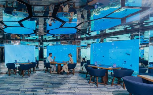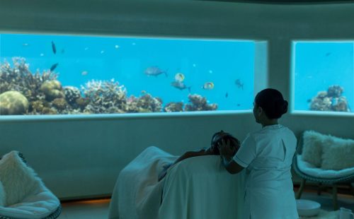 At Huvafen Fushi, an underwater spa transforms wellness into a meditative experience shaped by coral light and the quiet rhythm of the reef.