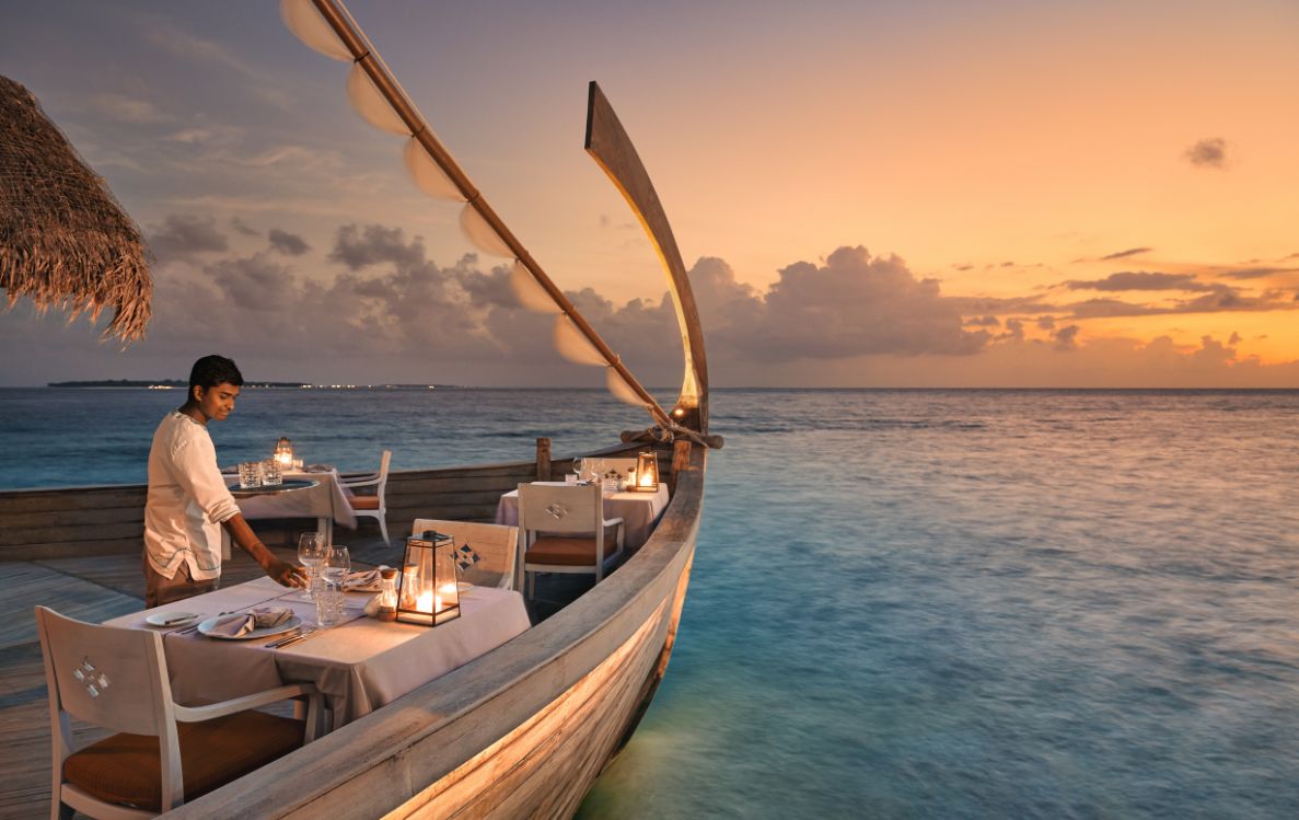 Ba’theli remains singular in its setting: three traditional dhoni boats poised above the lagoon, offering uninterrupted sunset views and the gentle rhythm of water beneath the floorboards. The architecture itself becomes part of the narrative, an homage to the maritime history that shaped Maldivian cuisine.