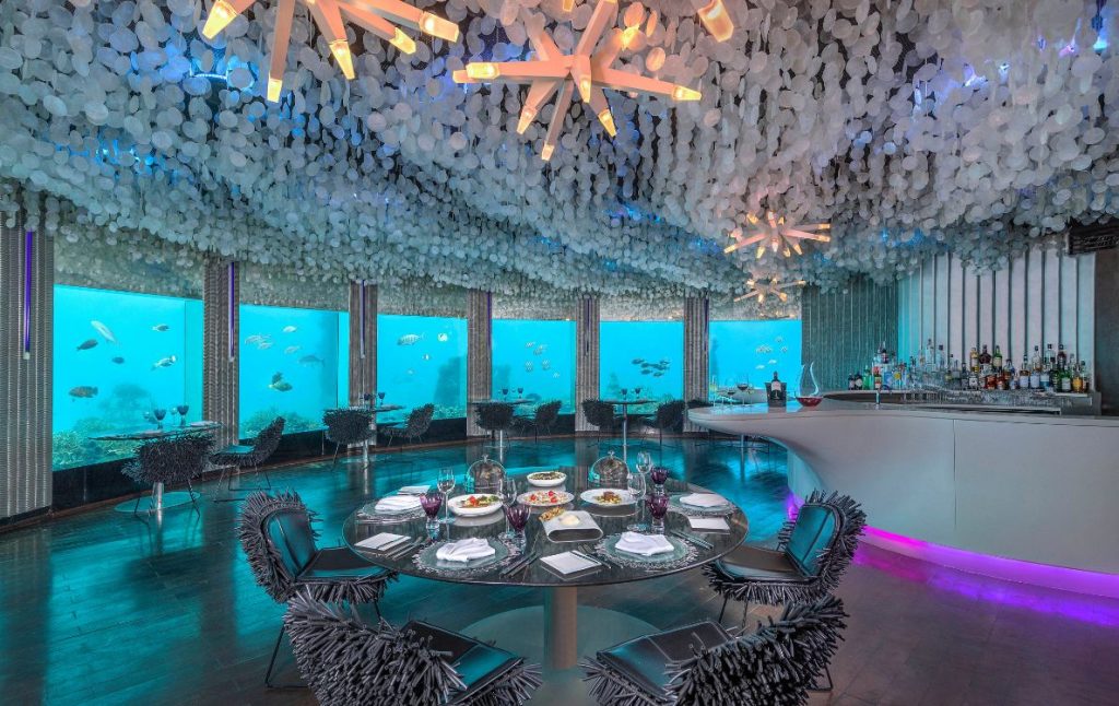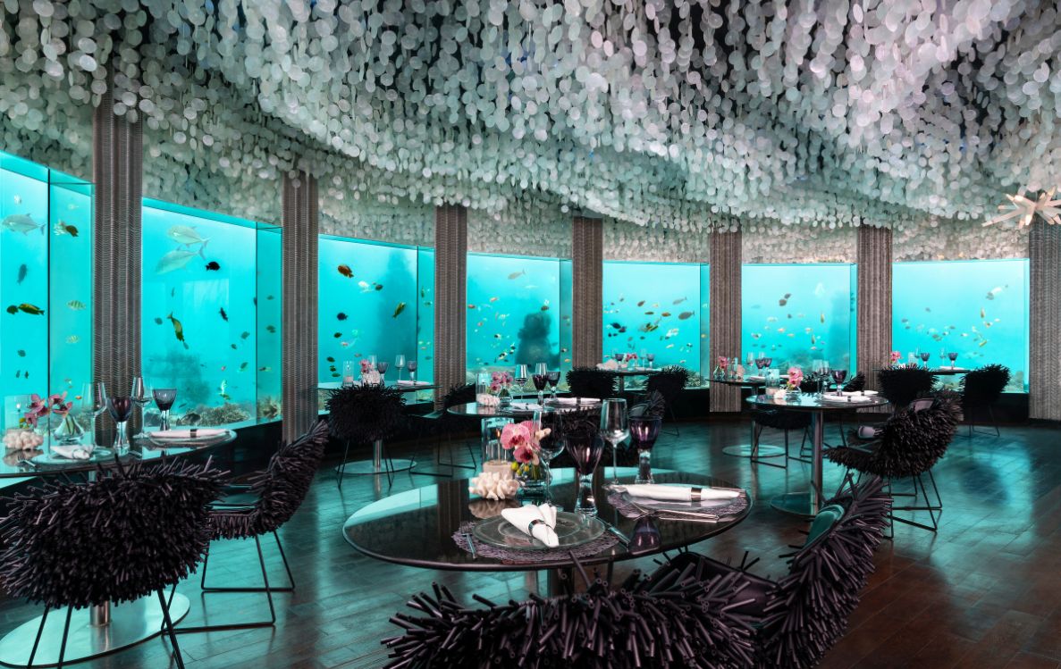 Six metres below the ocean’s surface, the restaurant opens into a surreal underwater setting. Italian chandeliers glow like coral formations, capiz shells ripple overhead, and plush anemone inspired seating faces the floor to ceiling windows where reef life drifts past.