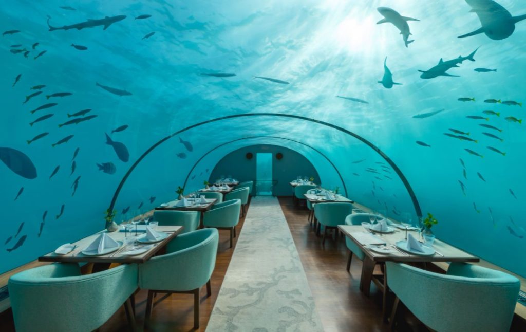 Since opening in 2005, Ithaa Undersea Restaurant has reigned as the world’s first undersea restaurant, a title that continues to shape its mystique. Positioned five metres below the Indian Ocean, the intimate space seats just 14 guests beneath a sweeping glass dome, where coral gardens and reef life glide past in quiet procession.