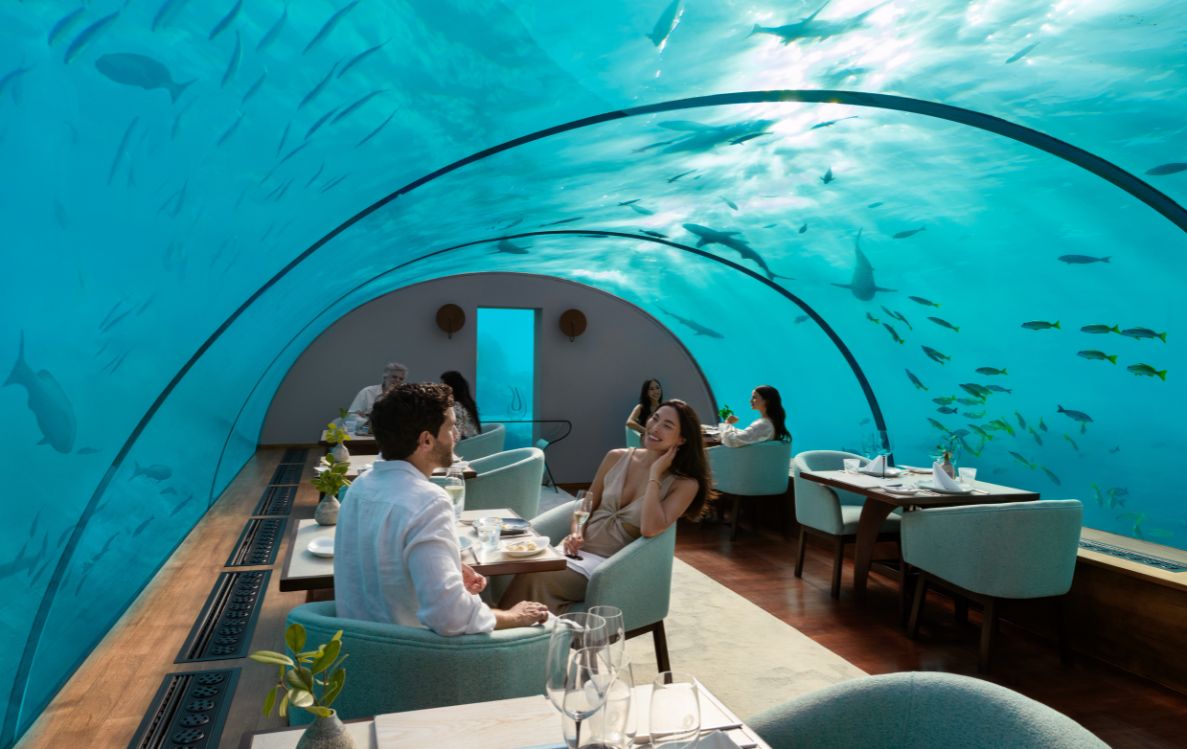 Since opening in 2005, Ithaa Undersea Restaurant has reigned as the world’s first undersea restaurant, a title that continues to shape its mystique. Positioned five metres below the Indian Ocean, the intimate space seats just 14 guests beneath a sweeping glass dome, where coral gardens and reef life glide past in quiet procession.