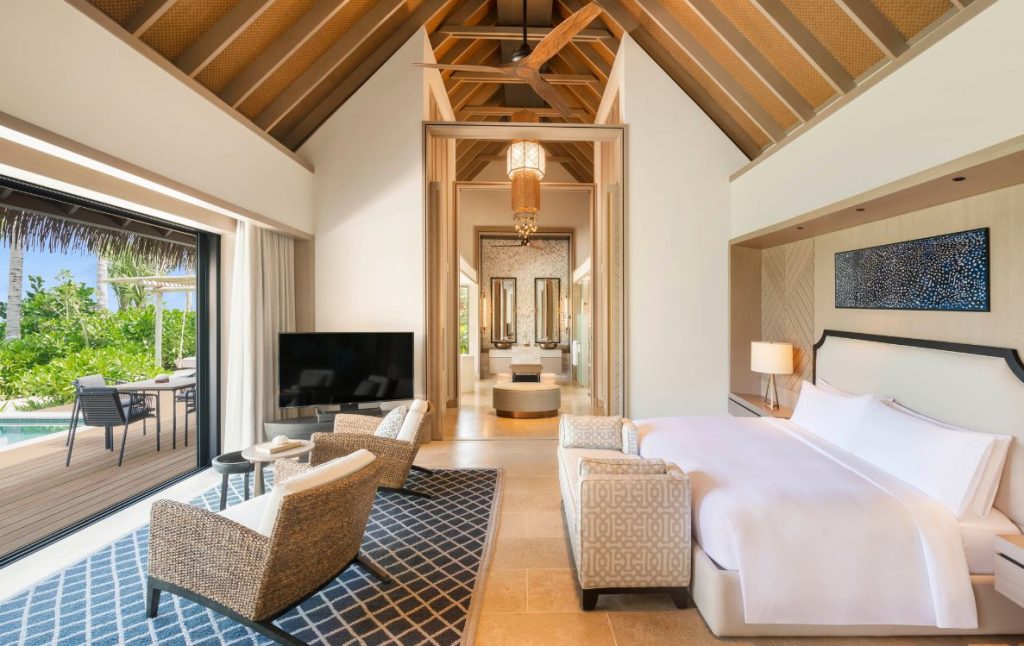 The experience feels less like a traditional resort stay and more like inhabiting a private island home. Floor to ceiling openings invite the landscape indoors, while generous terraces extend the living space toward the horizon. Sand, sea, and sky remain constant companions, framing each moment of island life.