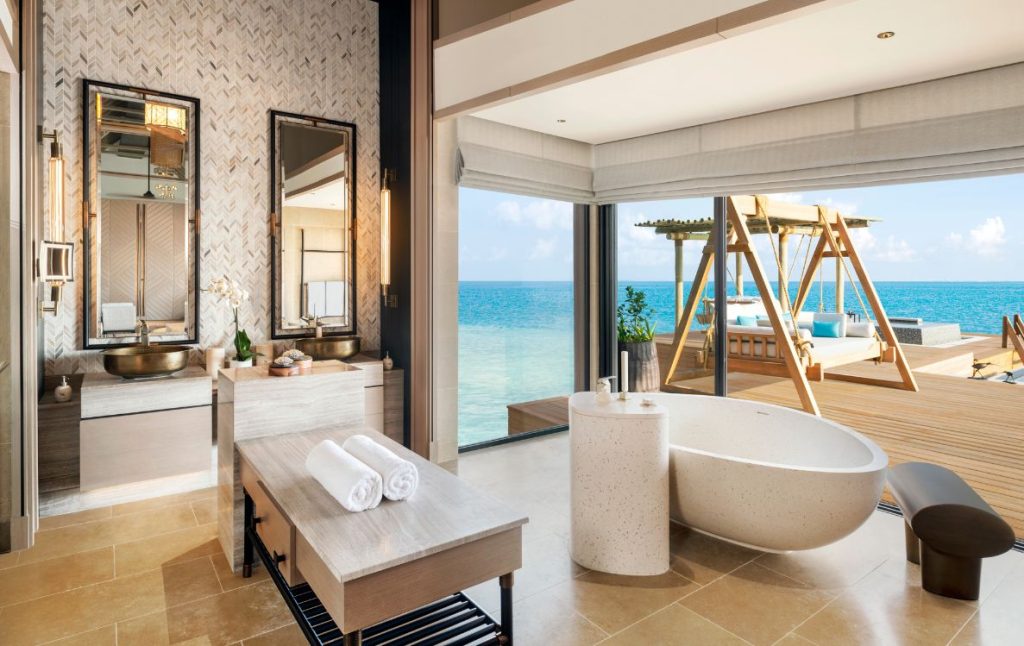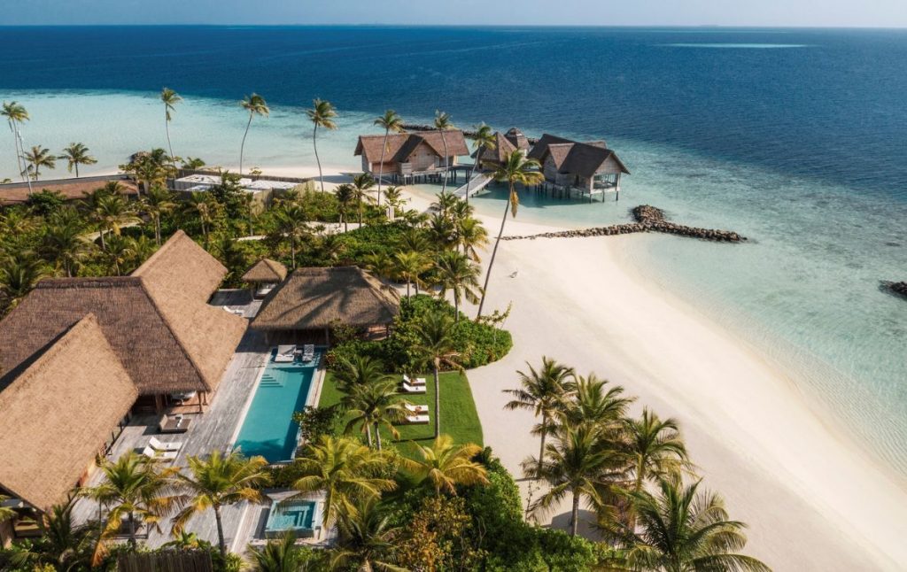 The residence includes a two-bedroom overwater villa, a three-bedroom beach villa, and a four-bedroom estate, complemented by a private spa, gym, entertainment centre, and five swimming pools. Dedicated concierge service and private chefs ensure that every moment of the stay unfolds seamlessly.